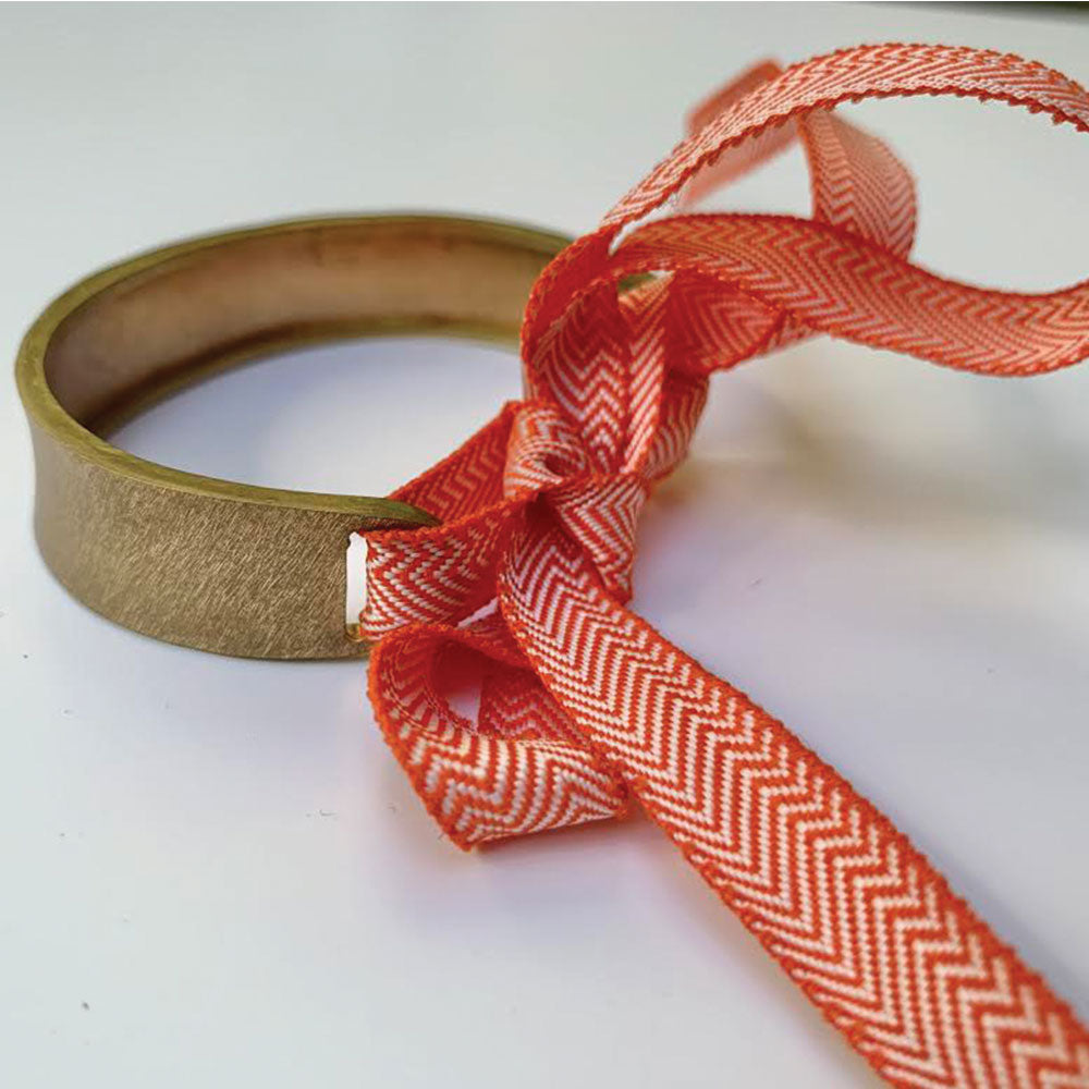 Esclava ancha, rayada hecha a mano de bronce con cinta rayada que puedes hacerle un nudo al lado o enrollar en tu mano.