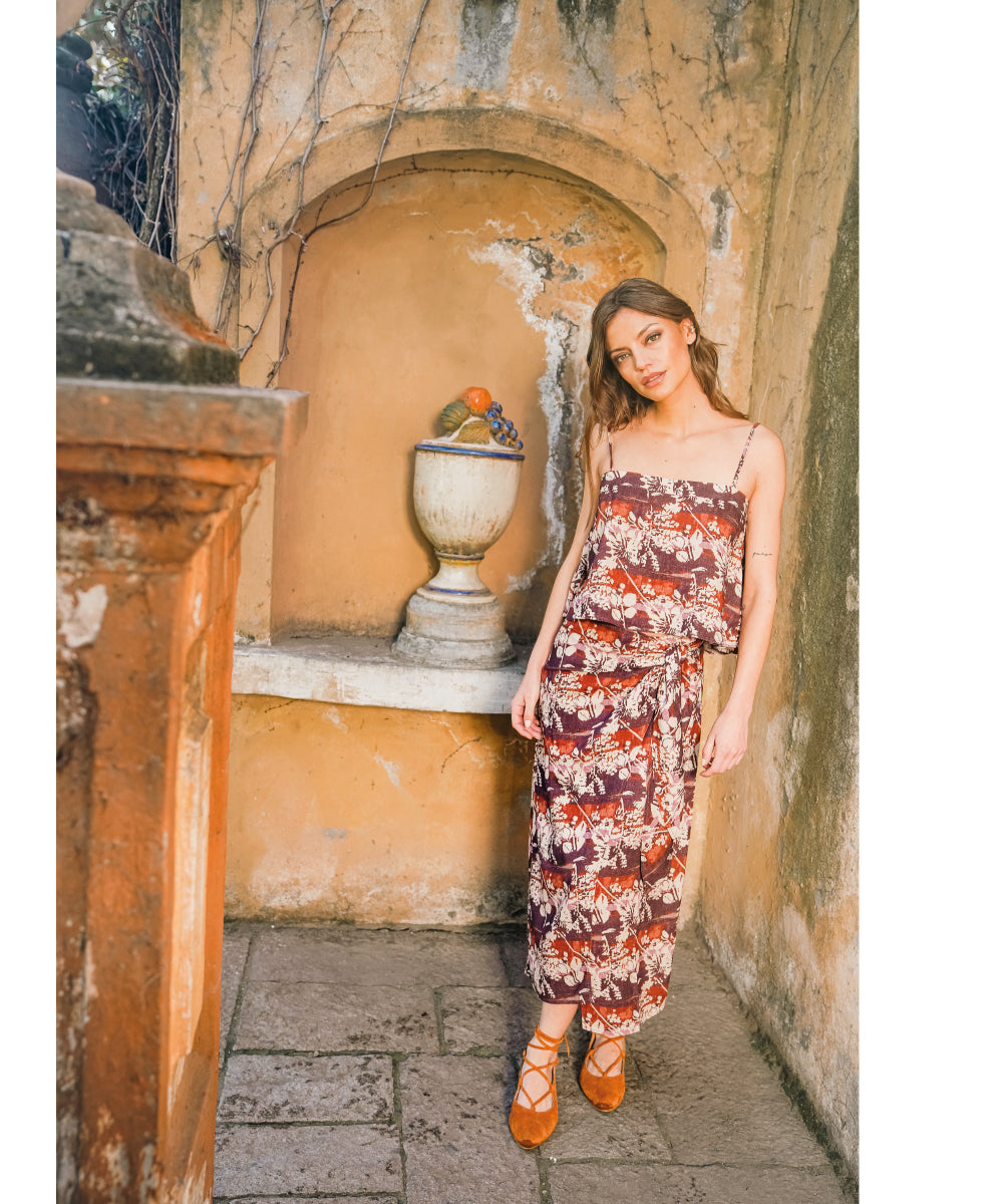Pollera de lino y viscosa estampada, muy cómoda y lo mejor que se adapta ya que se abrocha con un nudo en el delantero.