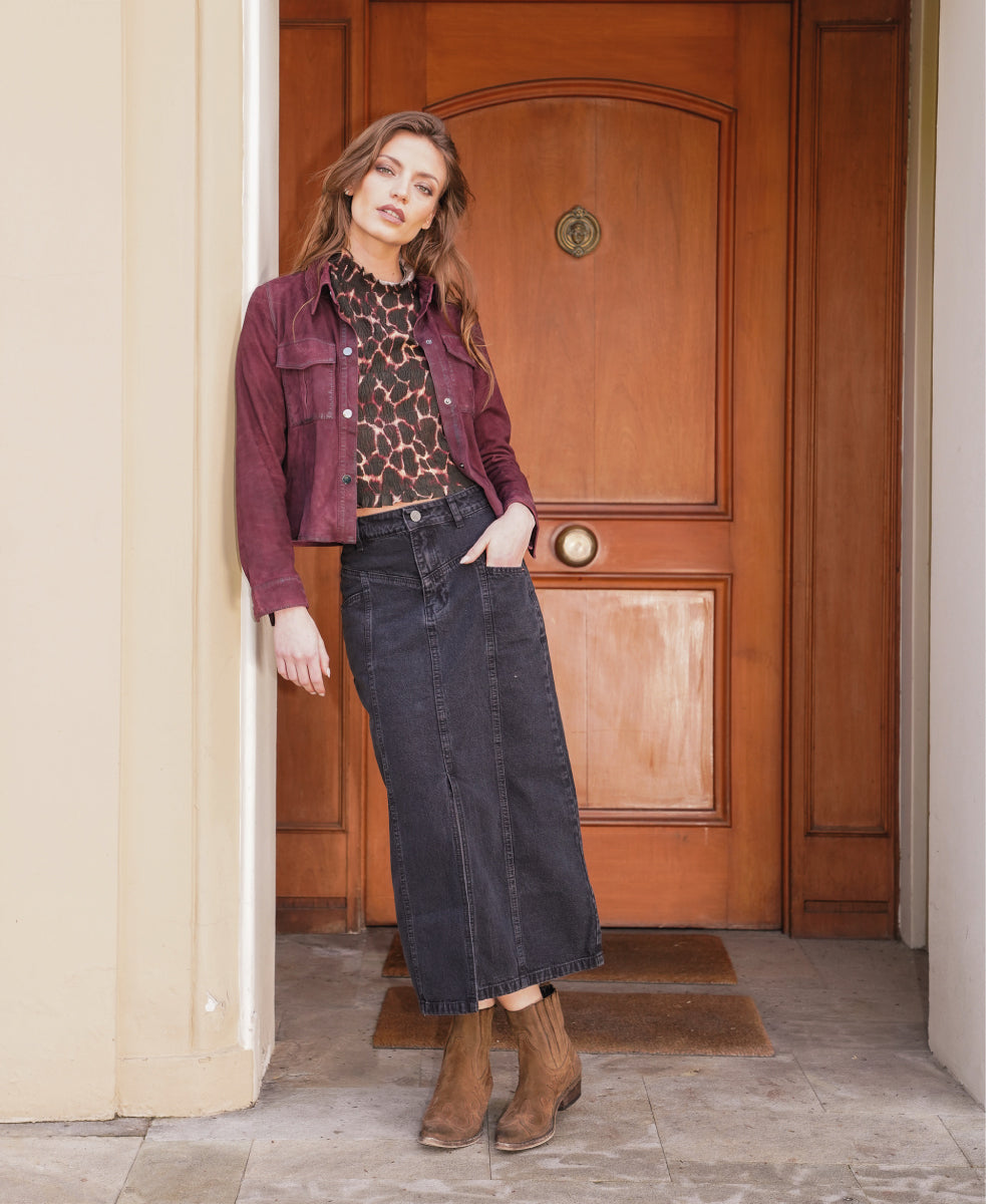 Si te gustan las polleras, eres de las nuestras! Vega esta hecha de un jeans en negro lavado, lo que termina siendo un color gris oscuro con distintos tonos en costuras.