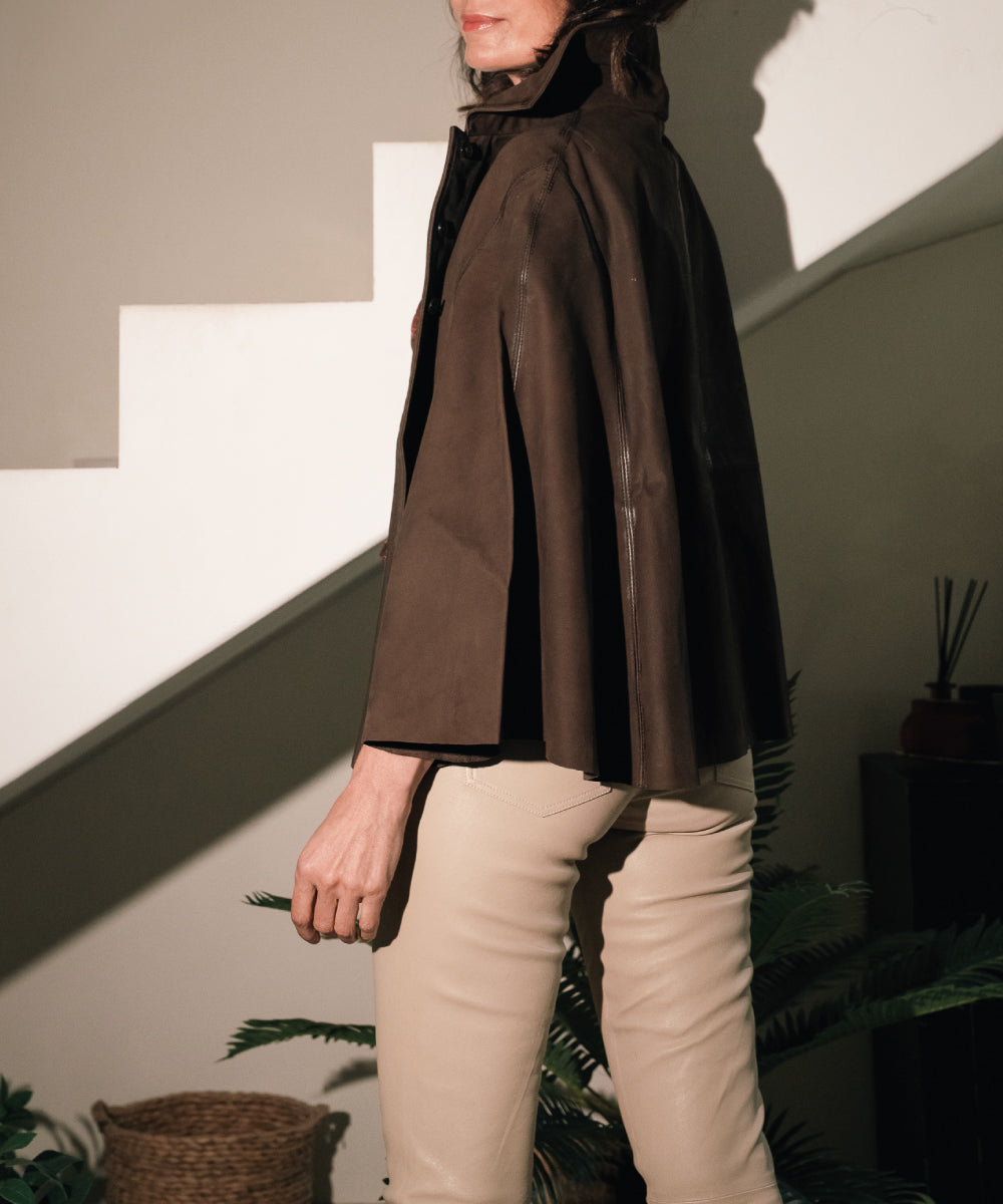 Un indispensable esta temporada es nuestra capa de gamuza. Elegante, imposible mas cool, para la noche, el día, matrimonios, abierta o cerrada.